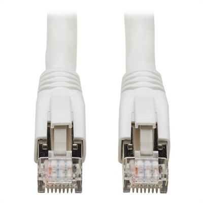 High-Speed Cat8 S/FTP Ethernet Cable Up to 4 Times Faster Than Cat6a. This certified Cat8 cable transmits 40 Gbps data, voice and audio/video through high-speed 40G equipment, including network switches, modems, routers, adapters, hubs and patch panels. Not only is its 40 Gbps data transfer speed four times that of Cat6a cable, but this Cat8 cable also supports bandwidth up to 2 GHz (2000 MHz) for carrying information and streaming video with no lag.Supports Power over Ethernet (PoE) to Cut Down on Power SuppliesBecause this Cat8 shielded cable supports PoE, it can supply the power to operate compatible PoE devices, such as security cameras, VoIP telephones, point-of-sale kiosks and access control devices. This saves you the expense and effort of purchasing, connecting and installing individual power supplies for each device. You can also install PoE devices in locations distant from power outlets, such as high on walls, ceilings or poles.Premium Protection from EMI/RFI Line Noise Helps Your Equipment Perform BetterEMI (electromagnetic interference) and RFI (radio frequency interference) line noise is a common cause of performance problems. The 22 AWG S/FTP (shielded foiled twisted pair) cable’s foil shielding blocks disruptive line noise that can disturb your electronics and inflict hardware damage or data loss. This EMI/RFI filtering also helps your connected components perform better and last longer. Near-end crosstalk (NEXT) levels are practically eliminated, so you don’t have to worry about keeping your cables separated in crowded pathways or spend valuable time on field testing.Snagless RJ45 Male Connectors Add Extra Protection During InstallationThe RJ45 connectors’ snagless design protects the locking tabs from being damaged or broken off during installation. Integral strain relief provides extra flexibility, reduces stress and helps the cable move freely without cracking or breaking loose from the connector.Color-Coded to Avoid Misidentification That Can Cause Costly DowntimeThis Cat8 Ethernet cable features a durable white PVC jacket. The color-coding allows easy, fast identification in a crowded rack, patch panel or workstation, preventing the cable from becoming accidentally disconnected.