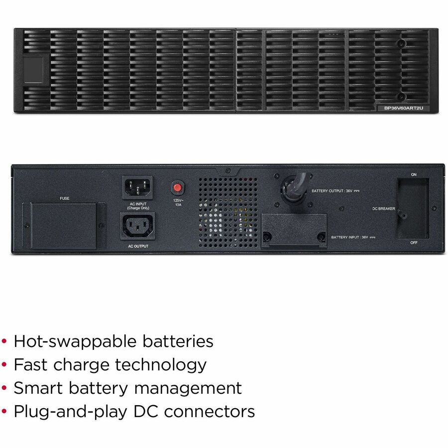 Up to ten EBMs can be added to the UPS, and the module’s DC plug-and-play power connectors allow for daisy-chaining additional EBMs to a UPS system. The BP36V60ART2U typically has a UPS charging time of 4 hours (0-90%), regardless of whether one or ten EBMS are installed, and comes with a three-year warranty.