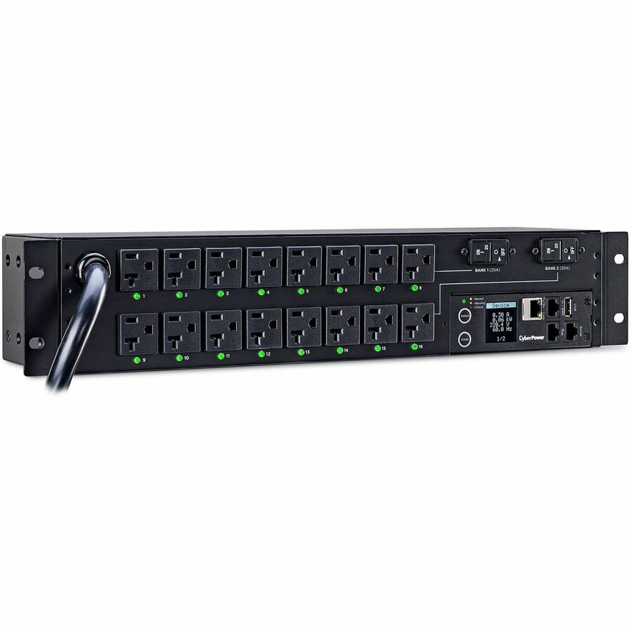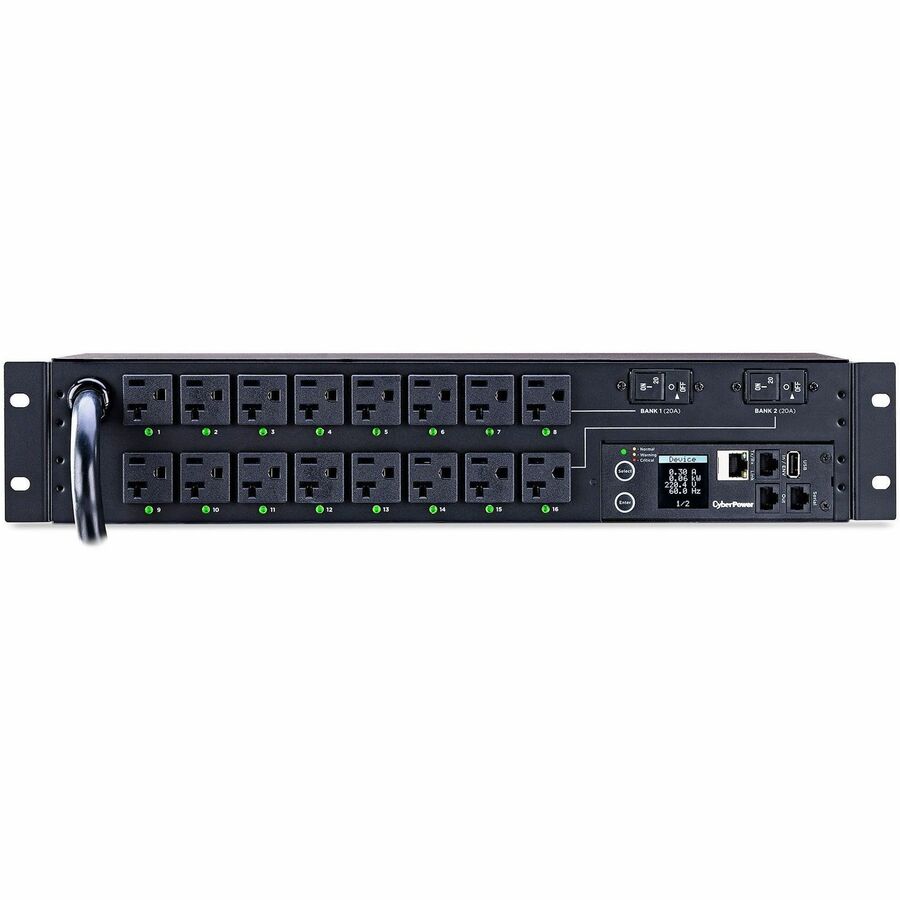 The CyberPower PDU41003, a 2U rackmount, monitored power distribution unit (PDU) provides 100-120Vac, 30A output via sixteen (16) NEMA 5-20R receptacles from a single NEMA L5-30P input power plug. The switched outlet receptacles can be managed individually or collectively over the network, using the CyberPower Management Console, a web browser, and the RJ45 Ethernet port for network connection, or locally from the Power Control Display.