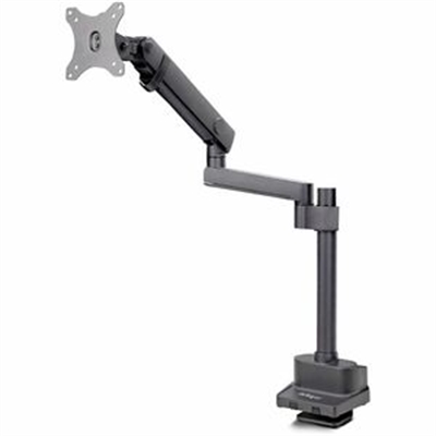 Monitor desk mount for up to a 40″ display and 17.6lb; Adjustable steel arm – Interchangeable C-clamp/grommet mounting for desks up to 2-inch thick; Top-screw desk clamp for easy installation – Includes tools for arm tension adjustment; Quick-release VESA plate – Mechanical spring arm w/ toolless adjustments of +/-180DEG swivel +/-90DEG tilt +/-90DEG screen rotation – Max spring arm 24.4″ height; 23.1″ max extension; Adjustable height along the 11.1″ pole – Cable management channel under arm