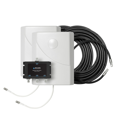 The Dual Antenna Expansion Kit includes two cellular panel antennas, one length of RG-11 cable (2ft), two lengths of 50ft RG-11 cable, and a 3 way 75 Ohm splitter.