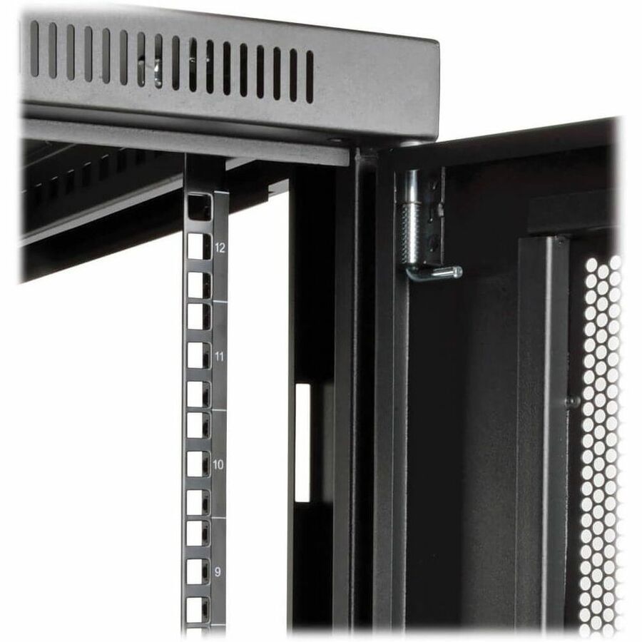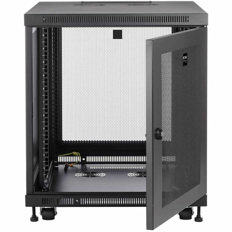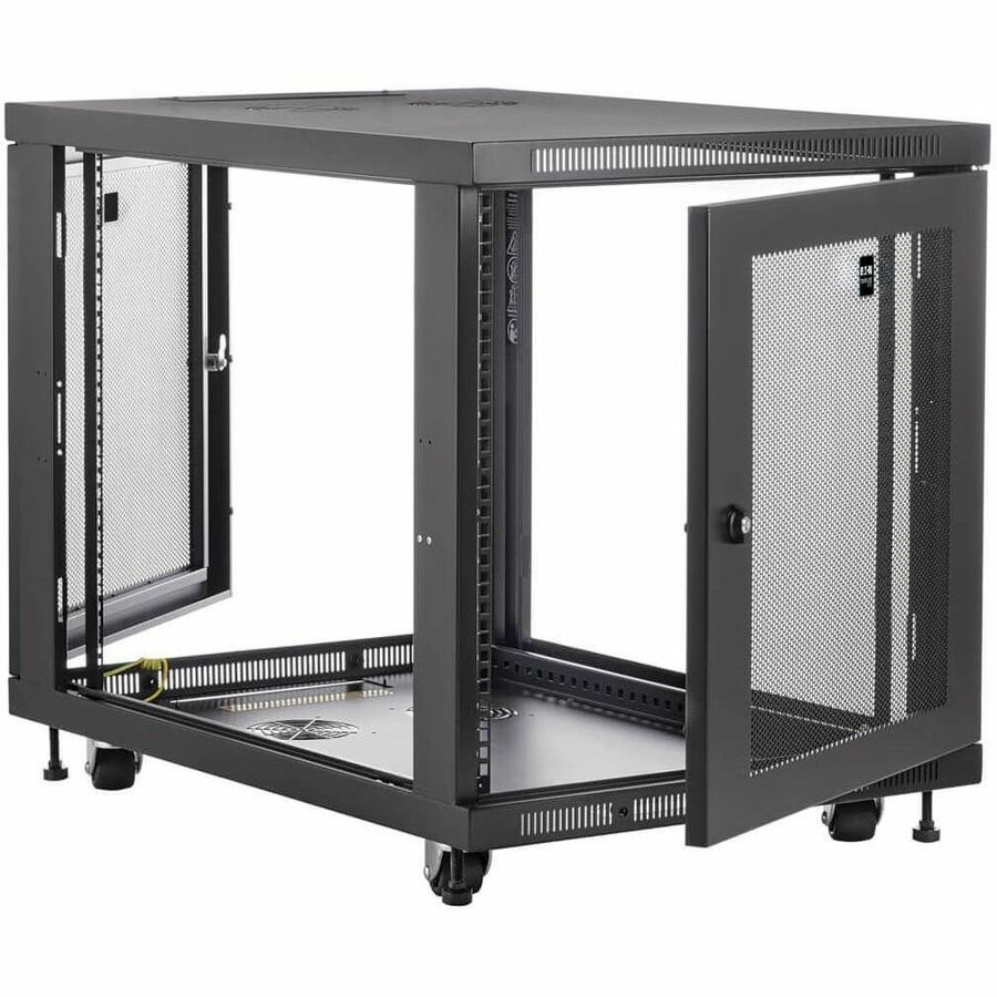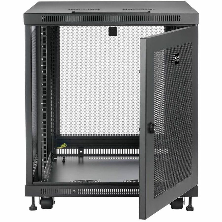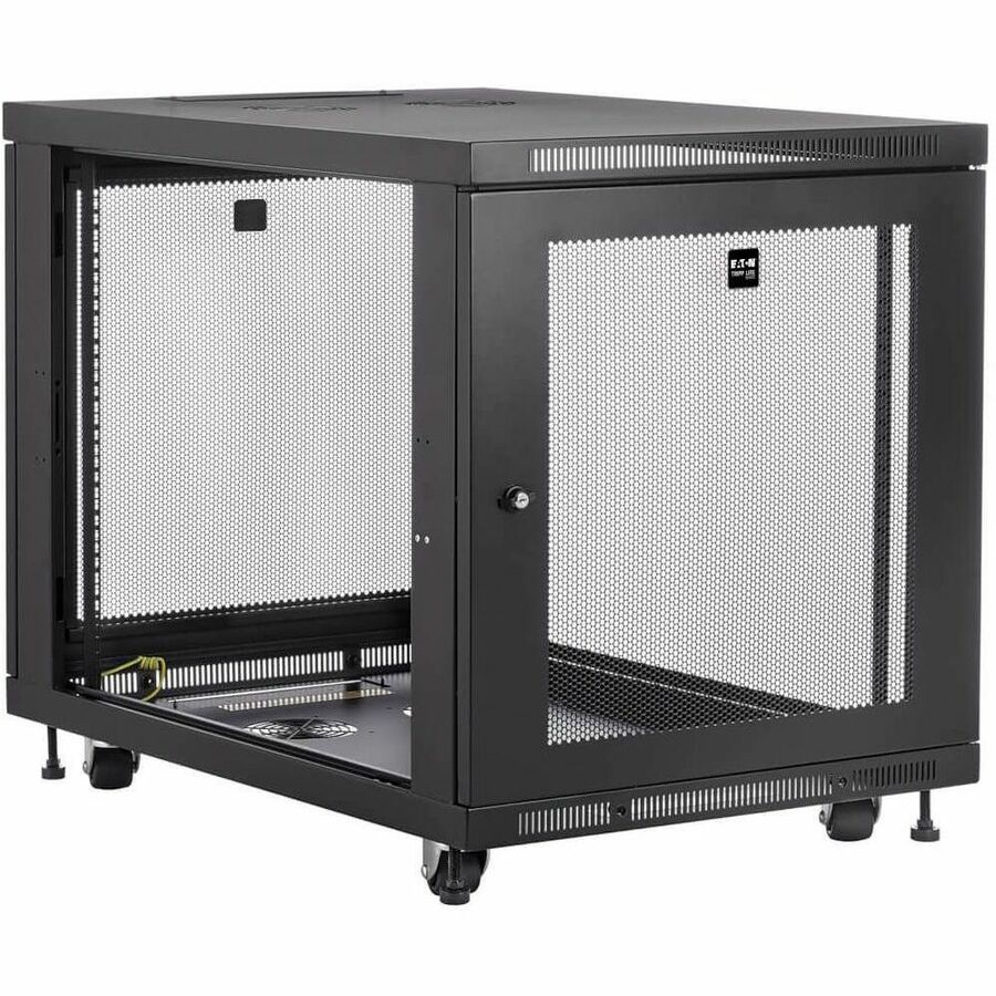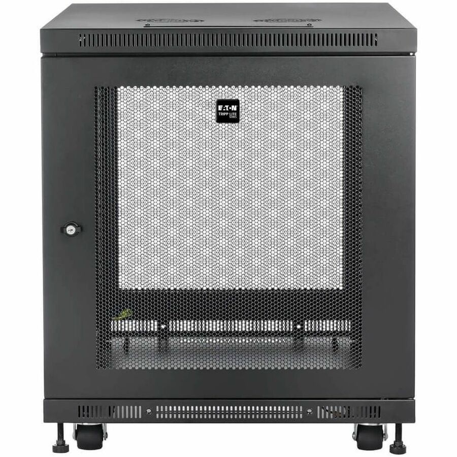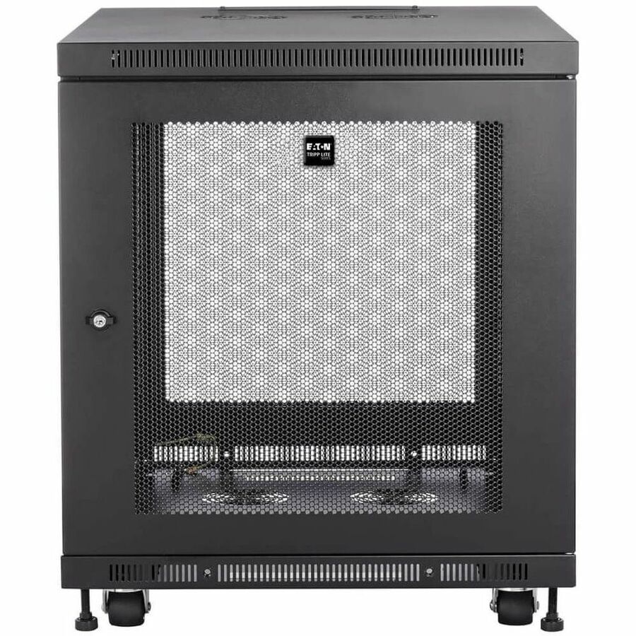 Tripp Lite’s SmartRack 12U Mid-Depth Rack Enclosure Cabinet is designed to simplify rack equipment installations and rack equipment maintenance. Compatible with all standard 19-inch rack equipment, it features front and rear pairs of vertical rails with square mounting holes. The rails are adjustable in quarter-inch increments to accommodate equipment depths from 3 to 32.5 inches, ideal for standard server installation. The rails are capable of supporting up to 1,000 lbs of equipment. The top and bottom panels are provided with ports for cable routing, and are furnished with vents designed to help remove warm air from the enclosure and draw in cool air by convection. The panels also support installation of standard user-supplied case fans(Tripp Lite SRFANWM). With a locking reversible front door and locking removable side panels, the SR12UB provides for the safe, secure installation of all equipment. To simplify deployment, the SR12UB comes with an accessory caster kit so it can easily be maneuvered into the desired location, and then secured in place by adjusting the unit’s levelers. It ships fully assembled for quick installation.