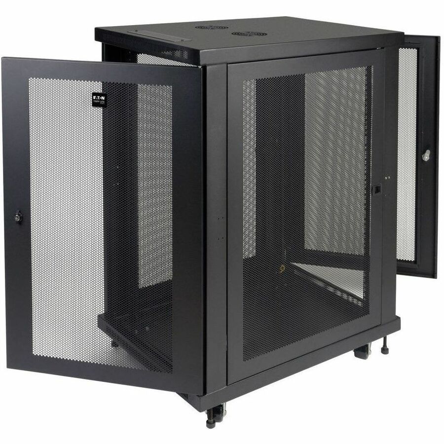 Tripp Lite’s SmartRack 18U Mid-Depth Rack Enclosure Cabinet is packed with features designed to simplify rack equipment installations and rack equipment maintenance: top and bottom cable routing ports, perforated door and side panels to promote efficient airflow, adjustable vertical mounting rails and more. And as part of the SmartRack family, the SR18UB is compatible with Tripp Lite’s extensive range of rackmount accessories, enabling you to customize your solution to meet any requirement. The SR18UB ships fully assembled for quick installation and comes with a 5-year warranty.The SR18UB is compatible with all standard 19-inch rack equipment and features front and rear pairs of vertical rails with square mounting holes. The rails are adjustable in quarter-inch increments to accommodate equipment depths from 3 to 32.5 inches, ideal for standard server installation. Adjustment is quick and convenient: simply unscrew the rails, slide them to the desired depth and restore the screws. The rails feature square mounting holes and are capable of supporting up to 1,000 lbs of equipment with included installation hardware. Each rack space within the enclosure is numbered for easy reference.With a locking, reversible front door and locking, removable side panels, the SR18UB provides safe, secure installation for all equipment. This prevents unauthorized access to installed equipment while making it easy for authorized personnel to perform inspections, maintenance and equipment replacement. The enclosure meets all requirements toward PCI DSS compliance.The top and bottom panels of the SR18UB are furnished with vents designed to help remove warm air from the enclosure and draw in cool air by convection. They also support installation of standard user-supplied case fans(Tripp Lite SRFANWM). The top and bottom panels are also provided with ports for cable routing.To simplify deployment, the SR18UB comes with an accessory caster kit consisting of 4 casters and all required installation hardware. With casters installed, the SR18UB can easily be maneuvered into to desired location, and then secured in place by adjusting the unit’s levelers. Note: the casters are intended for minor position adjustments within the final installation area only and are not designed for moving the enclosure over long distances.