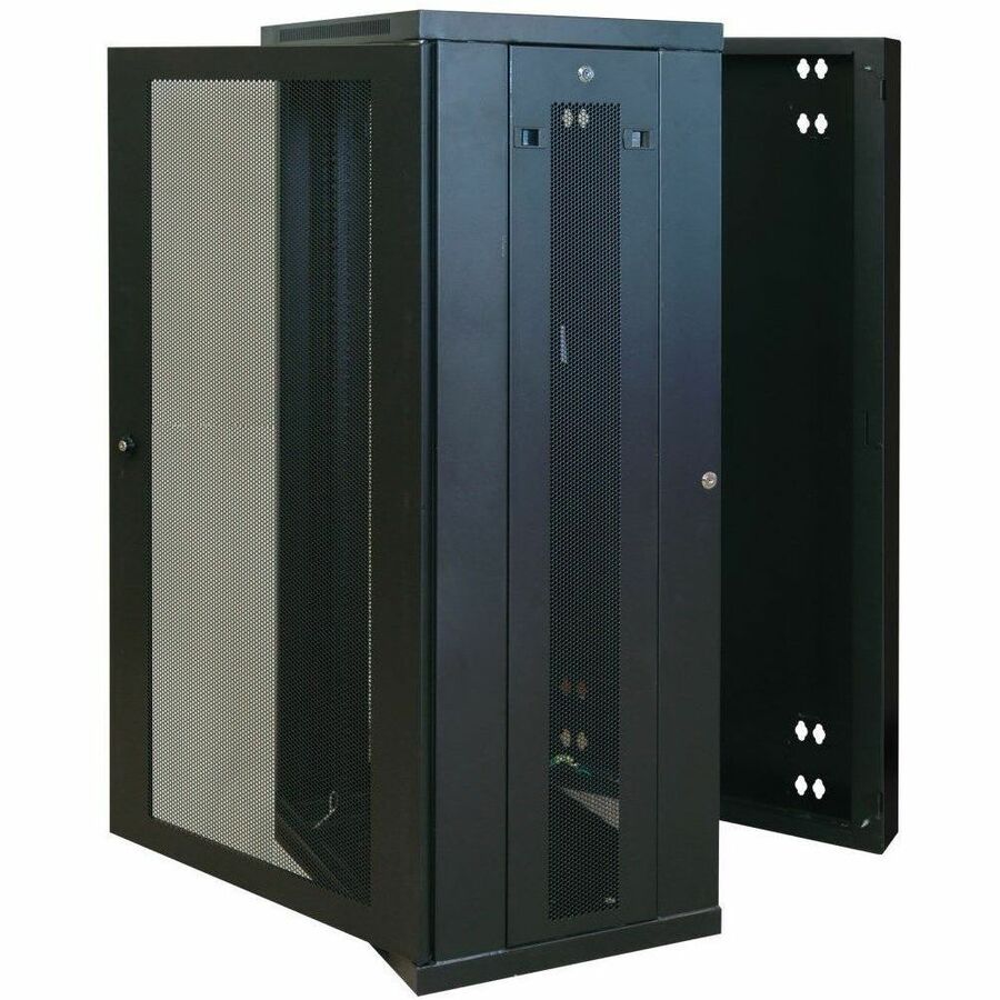 The SRW26US SmartRack 26U Low-Profile Switch-Depth Wall-Mount Rack Enclosure Cabinet is designed to house EIA-standard 19-inch rack equipment in network wiring closets, retail locations, classrooms, back offices and other areas with limited floor space where you need equipment to be secure, organized and out of the way. Constructed from heavy-duty steel with a durable black powder-coated finish, the cabinet has a maximum load capacity of 250 pounds.The cabinet swings away from the wall on a sturdy hinge, allowing easy back-door access to equipment and cabling during installation and maintenance. The doors and side panels lock securely to help prevent damage, tampering or theft. The front, top, bottom and removable side panels are vented, which allows air to flow freely and keep equipment cool. The reversible doors can open left or right by rotating the cabinet 180° before mounting. Convenient top and bottom ports allow easy cable routing. The SRW26US comes fully assembled and ready to mount to the wall, or use Tripp Lite’s optional SRCASTER rolling caster kit to make it a mobile rack. Square and threaded mounting holes and numbered rack spaces make equipment installation easy. The vertical mounting rails adjust in 7/8-inch increments to accommodate equipment up to 20.5 inches deep, such as network switches and patch panels.