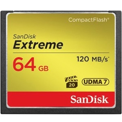Extreme CompactFlash Memory Card – 64GB. Ideal for use with mid-range to high-end DSLR cameras and HD camcorders, the SanDisk Extreme CompactFlash Memory Card delivers first-rate read/write speeds to catch fast action shots and enable quick file transfers. This memory card features Video Performance Guarantee (VPG-20) to deliver a minimum sustained recording data rate of 20MB/s3 to support high-quality Full HD video (1080p) 4 recording. Take advantage of burst-mode photography with the card’s write speeds of up to 85MB/s1 (567X) and enjoy efficient workflow with its transfer speeds up to 120MB/s2. With capacities up to 128GB5, this memory card provides plenty of storage for Full HD videos and RAW photos.