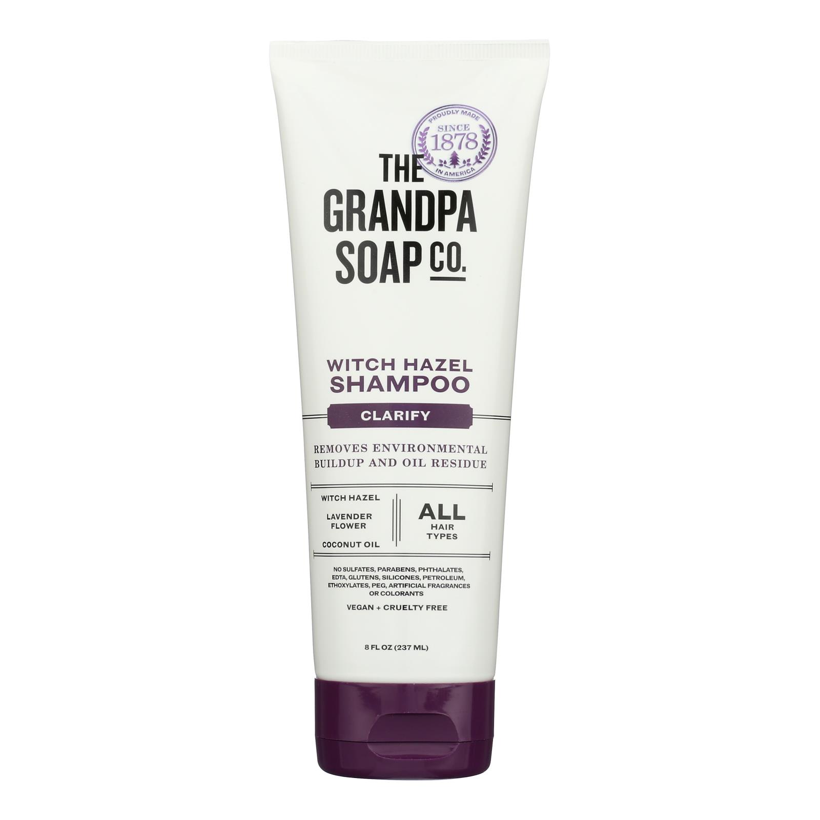 THE GRANDPA SOAP CO. WITCH HAZEL SHAMPOO REMOVES ENVIRONMENTAL BUILDUP AND OIL RESIDUE. THIS FORMULA IS FREE OF PARABENS, SULFATES AND ARTIFICIAL FRAGRANCES. IT CONTAINS WITCH HAZEL, LAVENDER FLOWER AND COCONUT OIL. THE TRIO WORKS TOGETHER TO LEAVE HAIR SHINY AND SMOOTH. A PERFECTLY CLARIFYING FORMULA FOR ALL HAIR TYPES. NATURAL AND GENTLE ENOUGH FOR DAILY USE. INCLUDES ONE 8 FL. OZ. BOTTLE OF SHAMPOO. HARDWORKING, SIMPLE, PURE INGREDIENTS ARE THE HEART OF OUR NATURAL SOAPMAKING TRADITIONS.