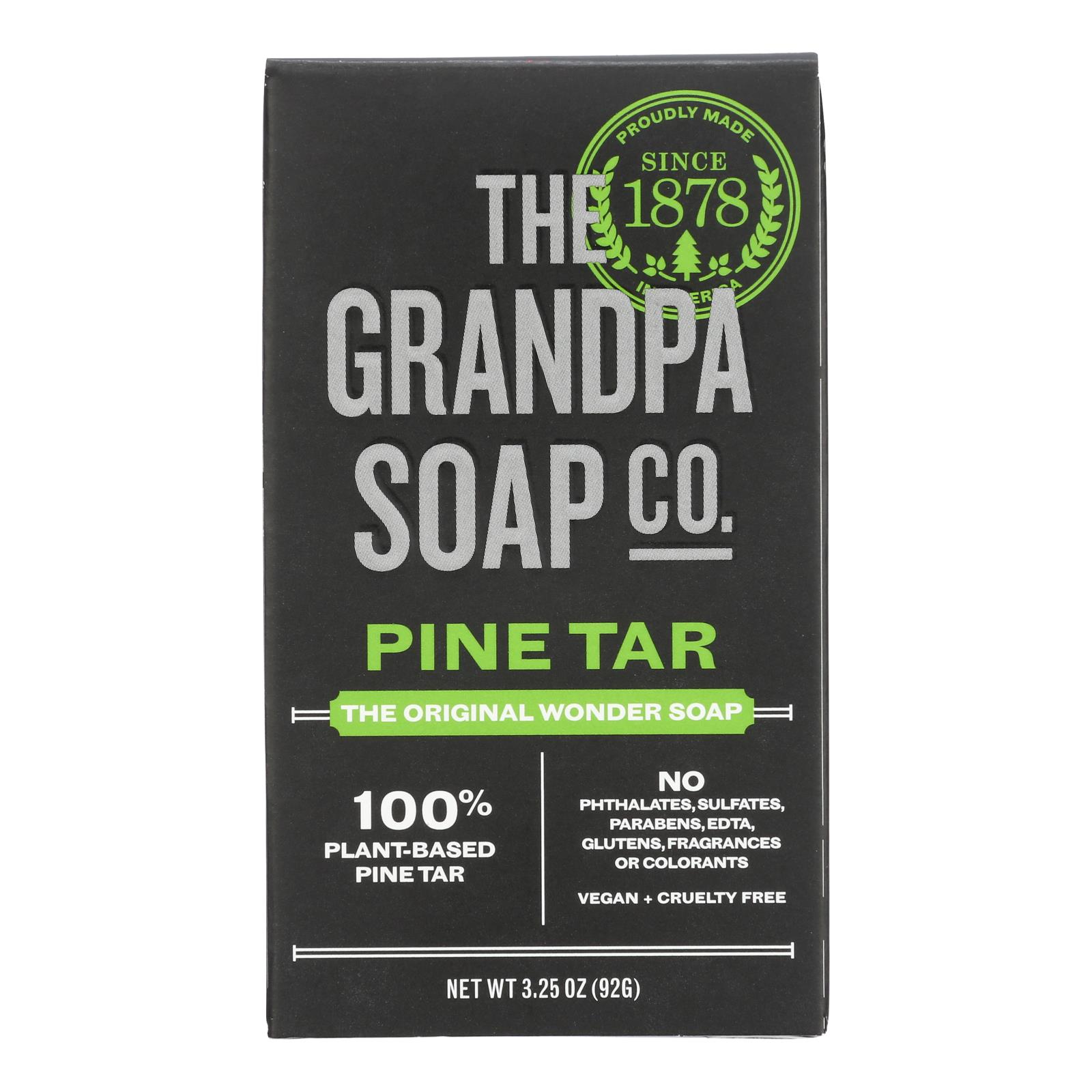 THE GRANDPA SOAP COMPANY, FACE, BODY & HAIR, PINE TAR IS AN ORIGINAL RECIPE. THIS PRODUCT IS 100% PLANT-BASED PINE TAR AND HAS A VEGETABLE BASE. THE GRANDPA SOAP COMPANY, FACE, BODY & HAIR IS IDEAL FOR SHOWERING, SHAMPOOING AND FACIAL GROOMING AND DEEPLY CLEANSES, DEODORIZES, AND MOISTURIZES. THIS PRODUCT IS PACKAGED FOR YOUR CONVENIENCE AND CONTAINS 3.25 OZ. OF PRODUCT.
