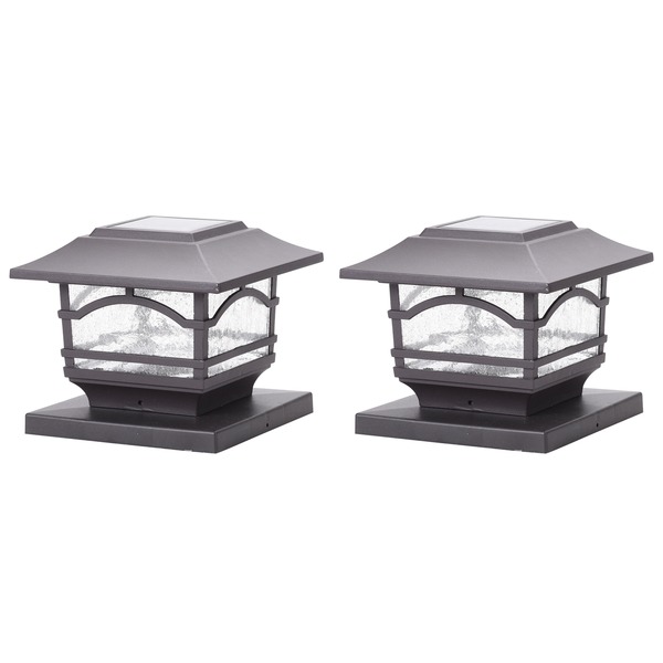 • Ideal addition to deck, fence, railing, post tops, garden, or outdoor space;• Cap lights convert energy from sun during the day to light up at night without need for cords or electrical outlets;• LEDs can stay lit for up to 8 hours at night;• Classic, timeless look with a warm, white light;• Easy installation does not require an electrician;• Includes mounting hardware and 2 adapters to fit 6 in. x 6 in. posts;• Dark Bronze;