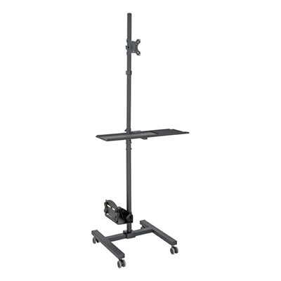This workstation with monitor mount has four swivel casters, so you can roll it wherever your work takes you. The placement of the monitor and keyboard tray are adjustable, so you can use the DMCS1732S as a standing desk or a sitting workspace at home, school or the office. Because of its small footprint, the workstation fits in spaces too small for a traditional desk. When not in use, the workstation can be rolled into a secure area for storage. Two of the casters lock to prevent unwanted movement.