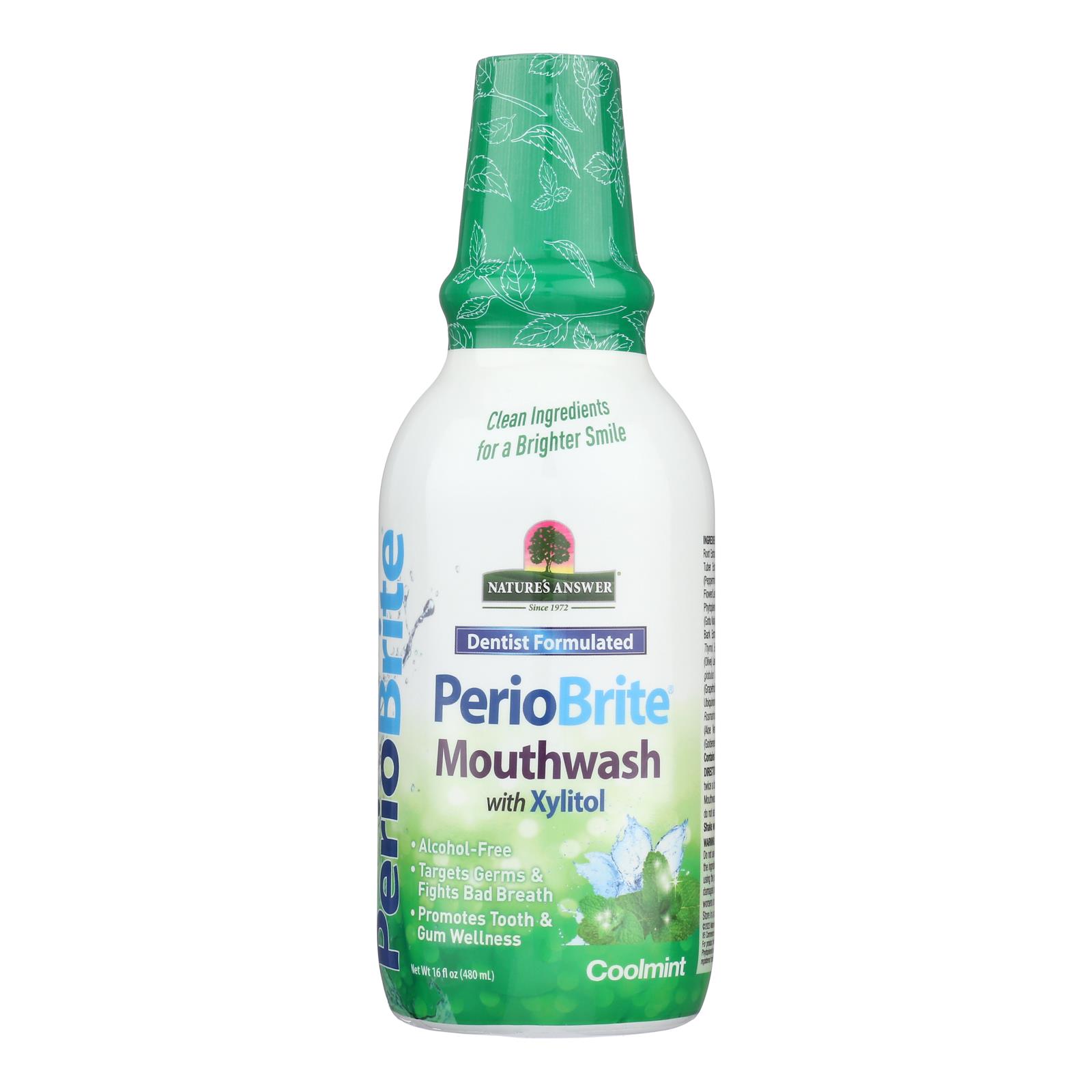 NATURE’S ANSWER PERIOBRITE COOL MINT NATURAL MOUTHWASH BLENDS THE CLEANSING PROPERTIES OF WILD-CRAFTED HERBS WITH OREGANO, FOLIC ACID, CLOVES AND CINNAMON TO CREATE A MOUTHWASH THAT MAY HELP PROMOTE THE HEALTH OF YOUR TEETH AND GUMS. SWISH TWO CAPS OF THIS MOUTHWASH AFTER BRUSHING YOUR TEETH FOR A COOL, REFRESHING SENSATION. STORE THE 16 FL. OZ. BOTTLE OF THIS NATURAL MOUTHWASH IN A COOL, DRY PLACE.