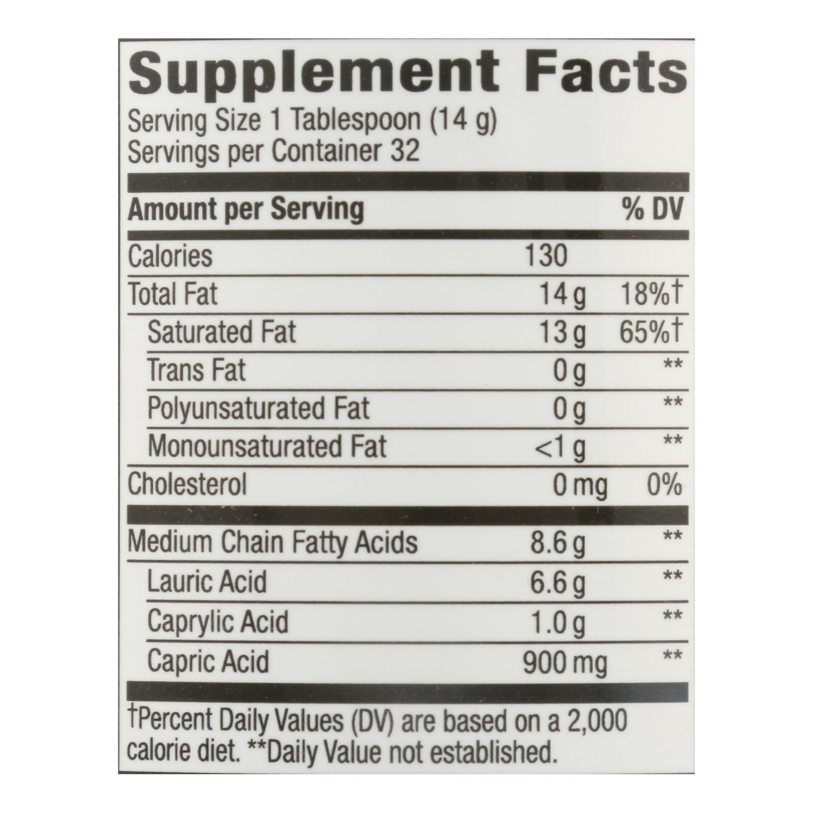 NATURE’S WAY ORGANIC EXTRA VIRGIN COCONUT OIL DIETARY SUPPLEMENT IS A DELICIOUS INGREDIENT FOR DIPS, SALAD DRESSINGS, SANDWICH SPREADS AND OTHER RECIPES. OUR ORGANIC OIL IS FREE FROM ARTIFICIAL INGREDIENTS, PRESERVATIVES, GLUTEN AND HEXANE TO MAKE IT SAFE AND SUITABLE FOR COOKING AT UP TO 250 DEGREES FAHRENHEIT. ONE JAR CONTAINS 16 OZ. OF OIL WITH 8.7 G. OF MEDIUM CHAIN TRIGLYCERIDES PER SERVING.