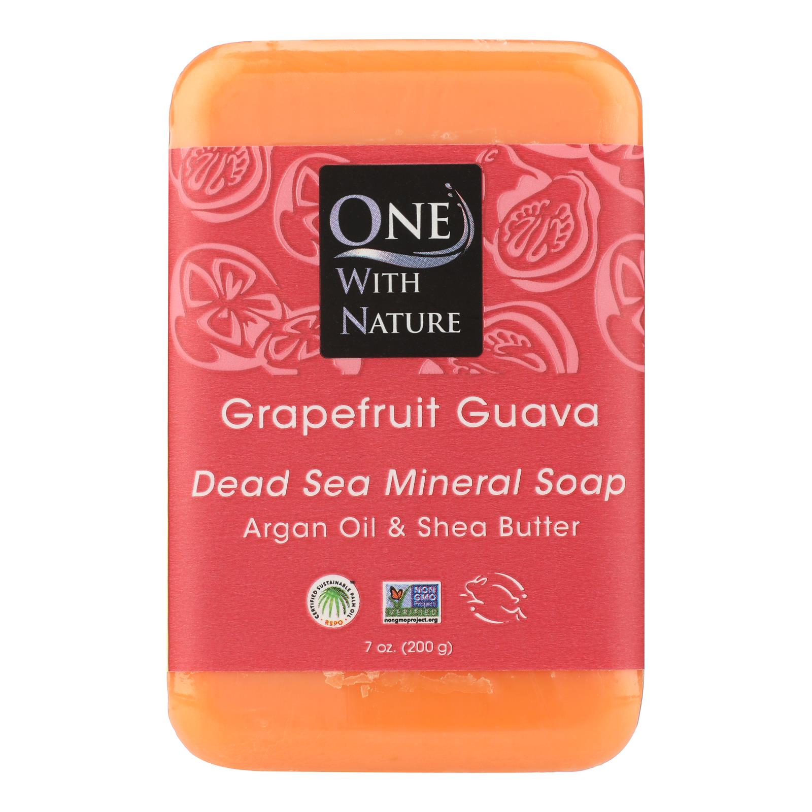 ONE WITH NATURE DEAD SEA BAR SOAP GRAPEFRUIT GUAVA IS A GENTLE YET POWERFUL SOAP. MADE WITH PRIMARILY WITH NATURALLY DERIVED INGREDIENTS, THIS SOAP IS LARGELY FREE OF UNNATURAL ADDITIVES. THIS PRODUCTS CONTAINS MOISTURIZING SHEA BUTTER AND ARGAN OIL. EACH BAR OF ONE WITH NATURE DEAD SEA BAR SOAP GRAPEFRUIT GUAVA WEIGHS 7 OZ.