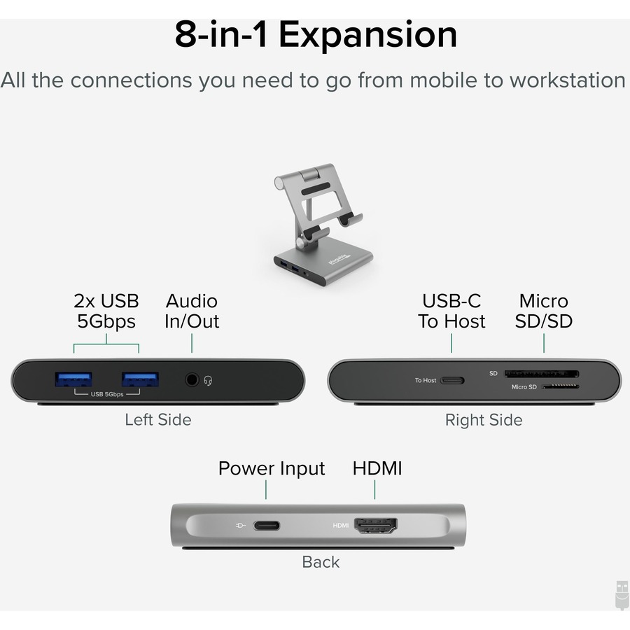 - 8 Port Hub – Get more from your mobile device with eight new ports, including an HDMI port, 2x USB 3.0 ports (5Gbps), SD card and Micro SD card, 100W pass-through charging, and an audio jack, all stashed away in the base of an easy to adjust stand