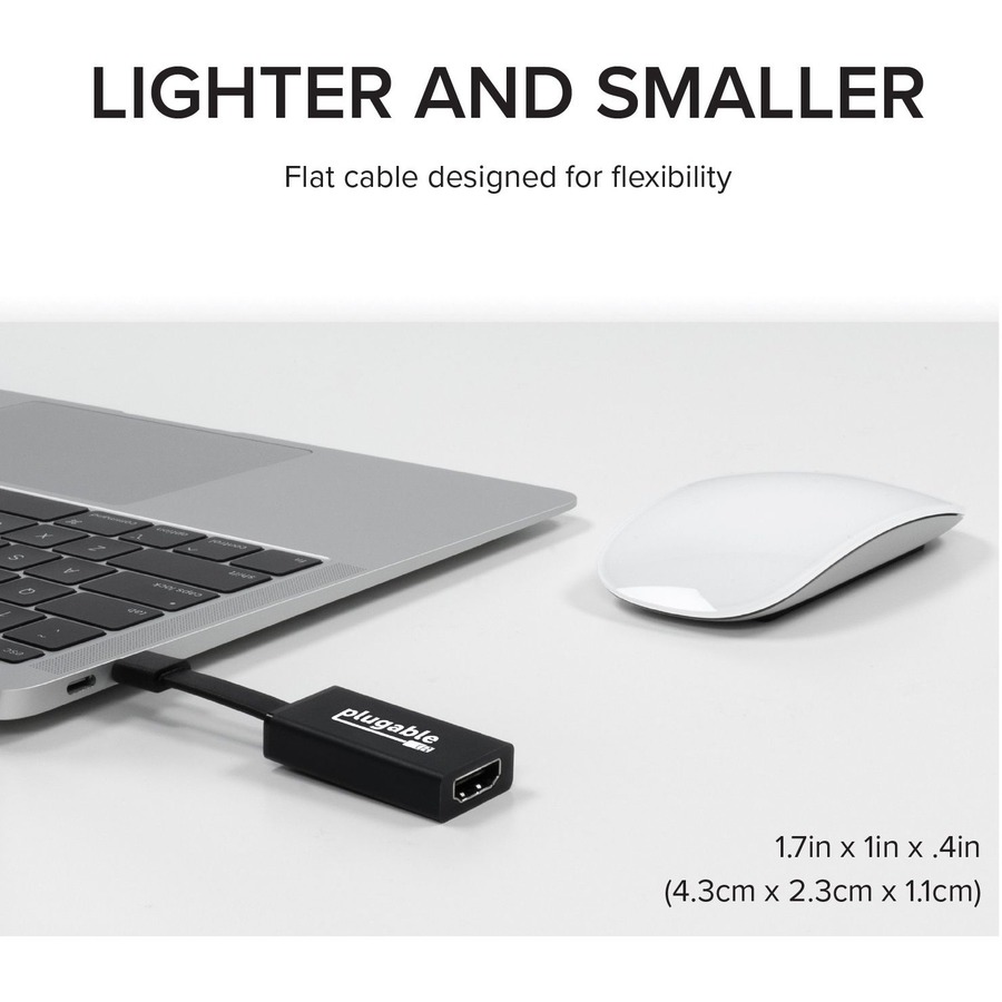 This compact adapter is under 2 inches in size, making it perfect for travel and taking on the go. Featuring a unique flat cable design, you can forget about messy cables and take advantage of the tight bend radius, which allows the adapter to fit in confined and compact spaces. The adapter enables an HDMI 1.4 output at resolutions up to 3840×2160 @ 30Hz (4K 30Hz) from systems which support “DisplayPort Alternate Mode” (Alt Mode) via USB-C.