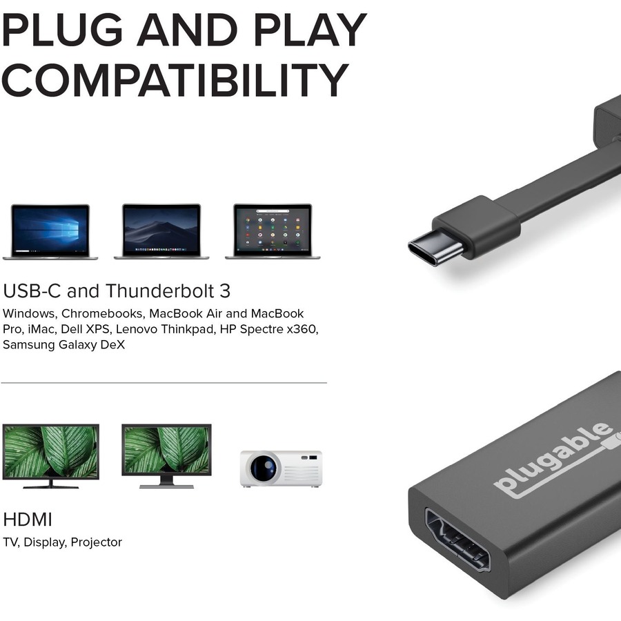 The Plugable USB-C to HDMI Adapter (USBC-THDMI) is for users who want to add a HDMI monitor, projector or television to their USB-C or Thunderbolt 3 compatible computer.
