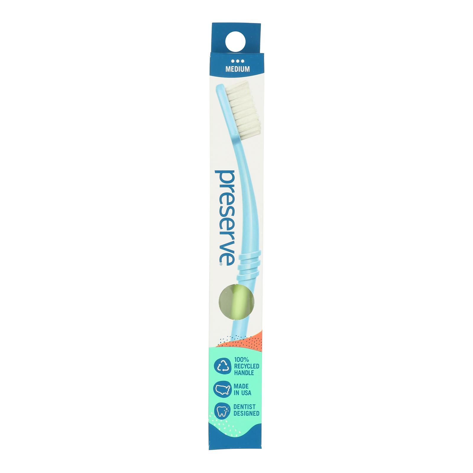 Powered by yogurt cups. 100% recycled handle with fresh nylon bristles. One day a yogurt cup, the next day a toothbrush. Nothing wasted. Everything gained. 100% recycled plastic. Recyclable. Dentist-designed. Curved handle helps clean hard-to-reach places. BPA free. Gimme. Reusable travel case. Recycle your Preserve toothbrush. Details inside. Made in USA.