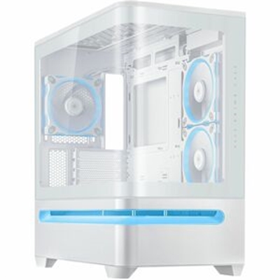 ASUS Prime AP202 ARGB White mATX case with fully tempered curved glass, supports graphics cards up to 420mm long, 360mm long radiators, easy-detach rail, patented slot vent, built-in three ARGB fans