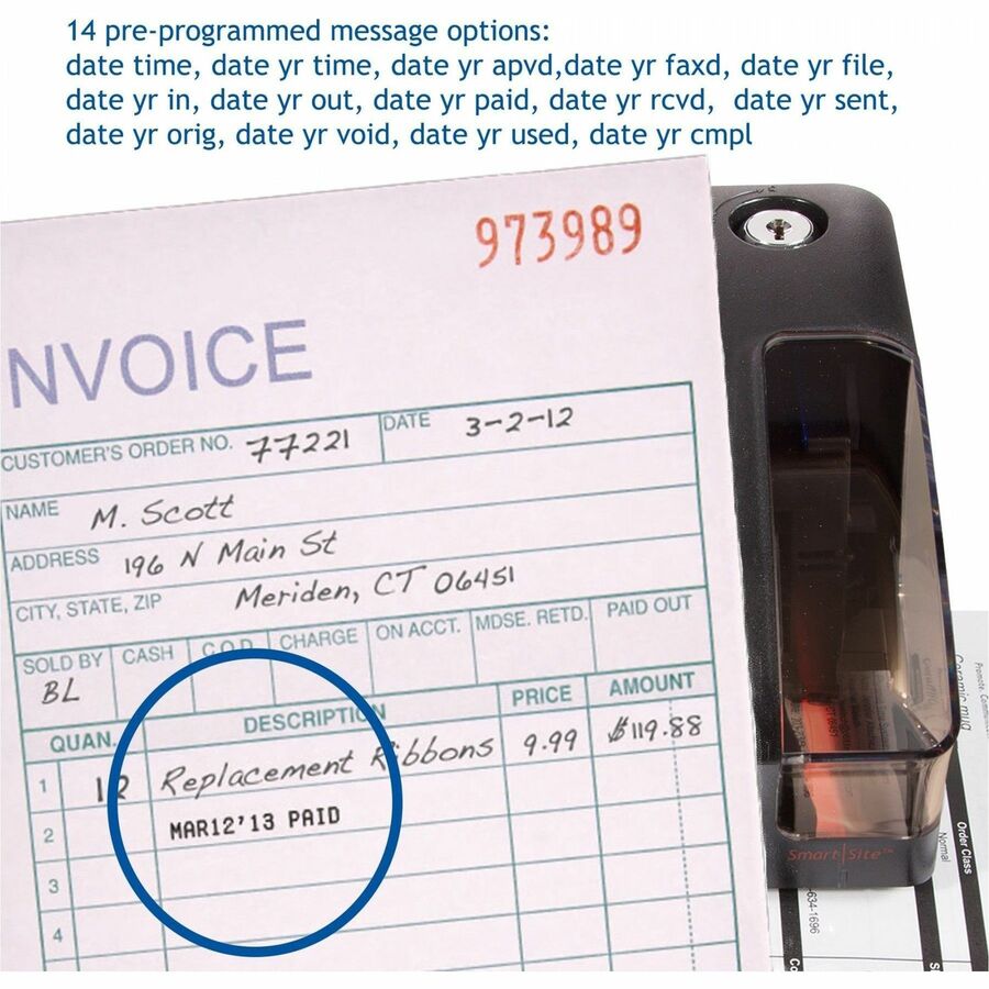 Keep track of job costs, record employee time and attendance, or stamp the date, time and up to 14 preprogrammed message options on time-sensitive documents such as incoming mail, attendance logs, or legal paperwork. Custom printing feature stamps date, time and up to 2 lines of custom alphanumeric type,up to 16 characters, such as company name, address, URL, etc. Counter mode enables sequential page numbering up to 9999 consecutive stamps.