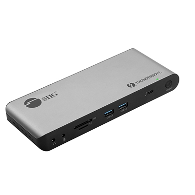Advanced Quad Display Thunderbolt 4 Docking Station with three Thunderbolt 4 USB-C, one DisplayPort, one HDIM, two USB-A 5G, two USB-A 480Mbps, one Gigabit Ethernet Port, one SD 3.0 card slot, one Micro SD (TF) 3.0 card slot, two stereo audio/microphone, and PD up to 60W for Windows and Mac