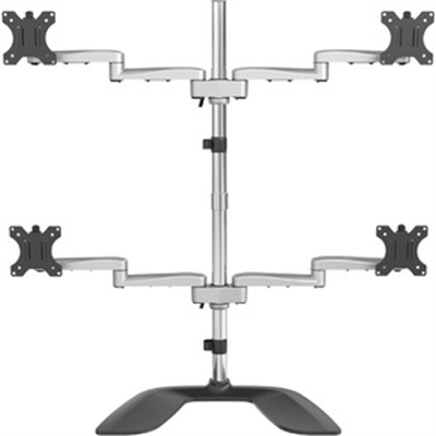 Increase productivity and save space by mounting four monitors to this attractive quad monitor stand 4 screen monitor stand for up to 32″ VESA mount monitors with max weight of 17.6 lb./8 kg per display Height adjustable along the 34″ (864 mm) pole Four articulating arms extend up to 16.6″ (42.2 cm) for a wide range of motion Create a four monitor setup with optimum viewing with 360 degree swivel and +90/ 40 degree tilt plus 360 degree rotation Steel and aluminum multi monitor stand