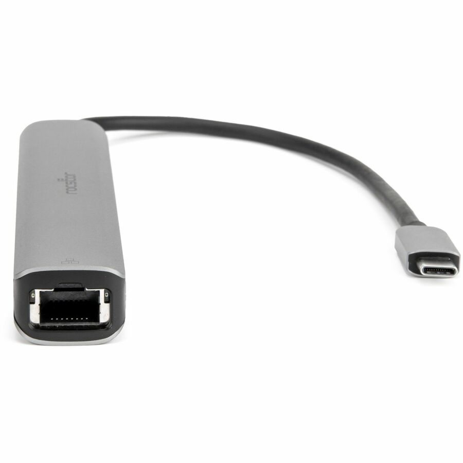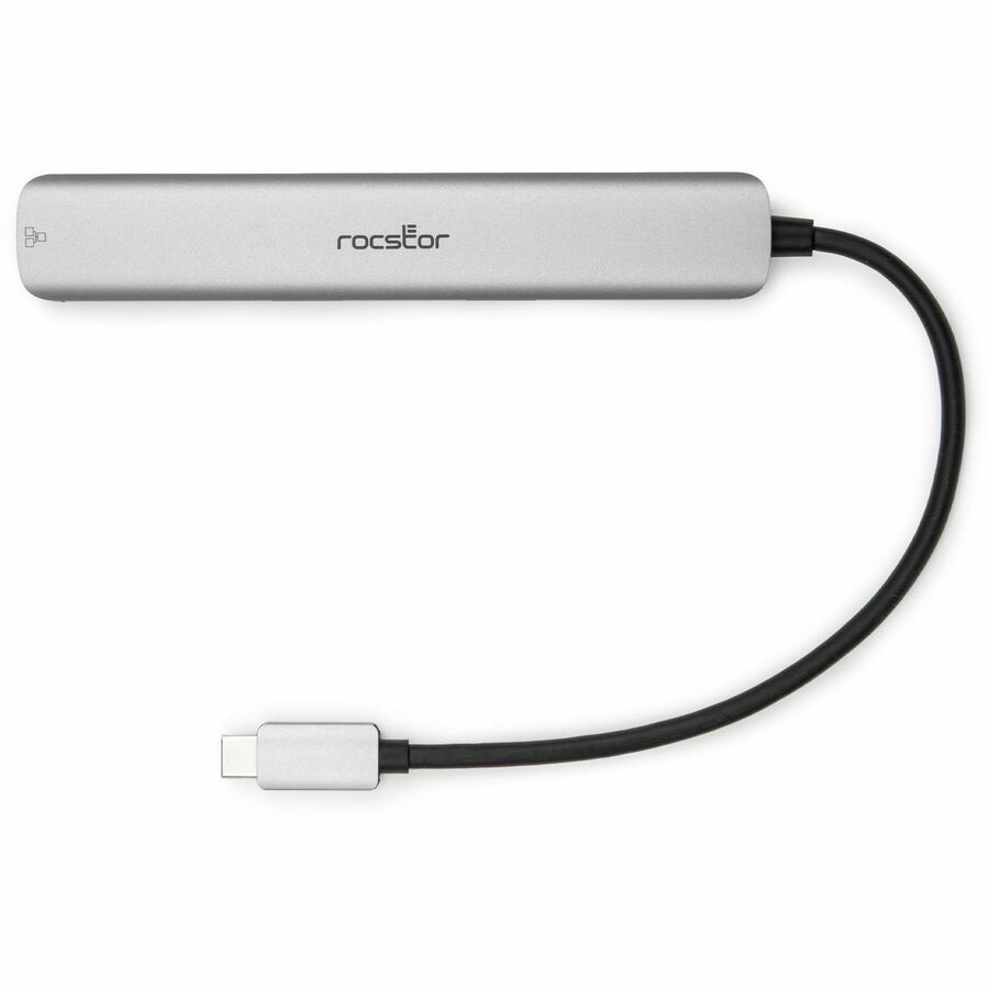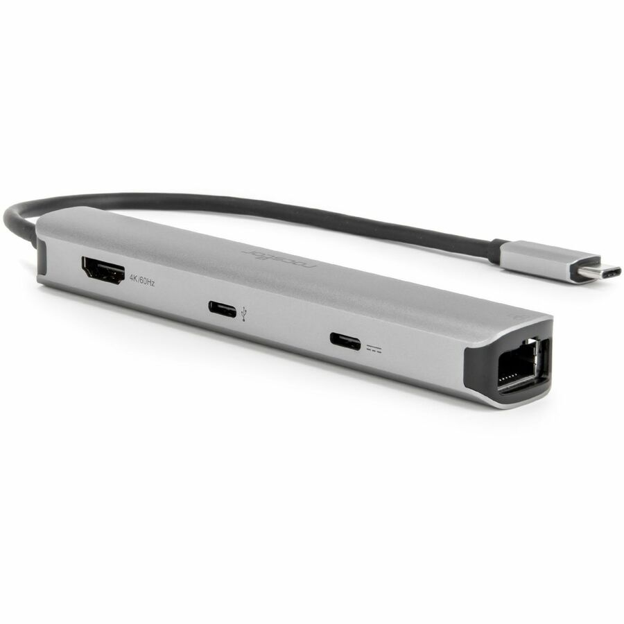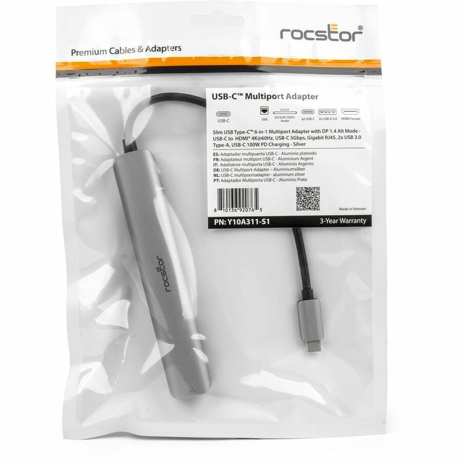 The Rocstor Premium Slim USB Type-C 6-in-1 4K Multiport Adapter is designed to enhance the connectivity options of Type-C and Thunderbolt 3/4 hosts, including PCs, laptops, and mobile phones. This sleek and versatile hub features an HDMI port, two USB-A ports, an RJ45 Ethernet port, an SD/Micro SD card slot, and a Type-C female port. Ideal for devices with a single Type-C port, this adapter is equipped with the latest DisplayPort 1.4 Alt mode supported IC, enabling HDMI video output at a maximum resolution of 4K @ 60Hz while simultaneously transferring USB 3.1 data at speeds up to 5Gbps. The RJ45 port ensures reliable and fast Gigabit Ethernet connectivity, enhancing your networking capabilities.