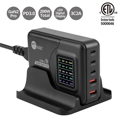 SIIG USB-C Charging Station – Portable USB Type-C Charger – Built-in LCD screen display – Maximum 200W output totally – USB-C up to 100W – USB-A up to 22.5W – Powerfull 5-Port high-power charger with three USB-C Ports / Compatible with PD 3.0 / PPS / Fast Charger 2.0 and two USB-A Ports / Quick Charge 3.0 fast charging – USB-C Charger with LCD Display – Ideal for Wiindows & MacBook Pro laptops / iPad Pro / Tablets / Smart Phones and Smartwatches – included Stand holder.