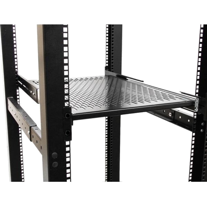 Offering a weight capacity of up to 50 lbs (22.7 kg), the sliding rack shelf features a ventilated, cold-rolled steel shelf on two locking adjustable rails which allow the shelf to be installed into cabinets or racks with mounting depths from 20in (510mm) to 30in (744mm). The locking feature locks the shelf 3/4 of the way out, preventing the shelf from accidentally falling out of the rack or sliding back in before maintenance is complete.