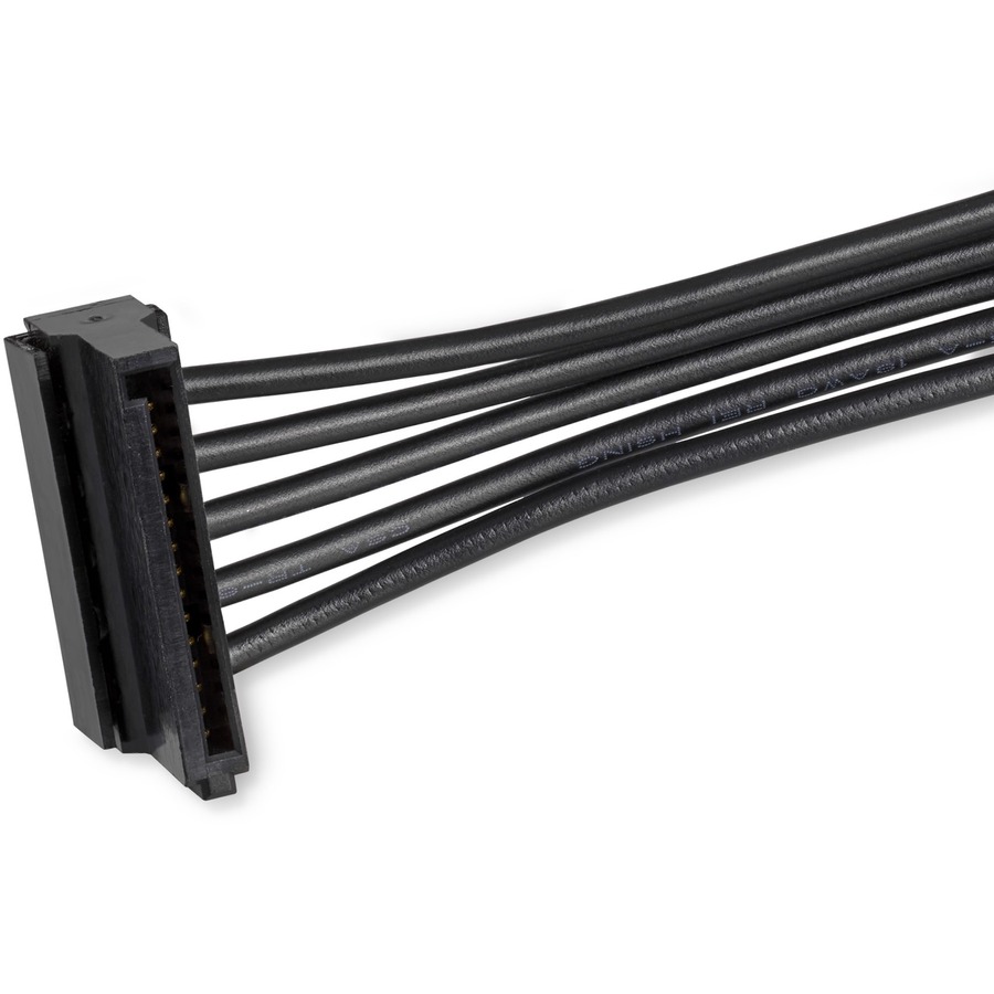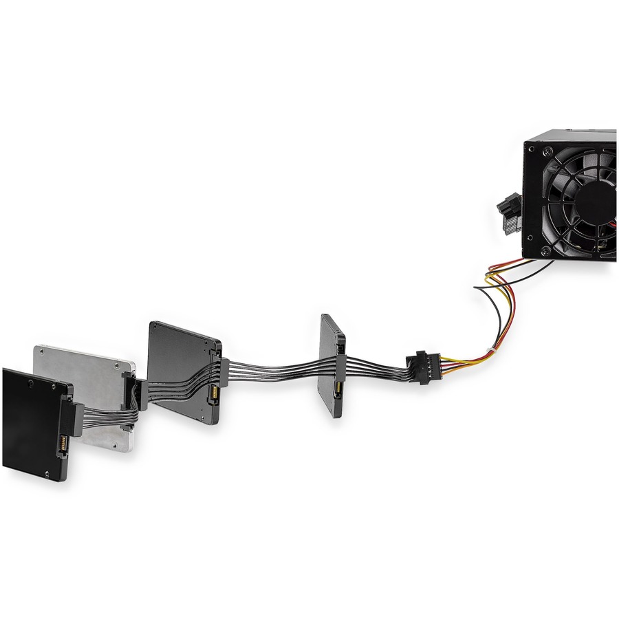 The SATA power splitter cable overcomes the limit of the number of SATA devices, such as SSD drives or SATA optical drives that can be installed in the system, based on available PSU power connections. The cable eliminates the cost of having to upgrade the power supply to accommodate additional SATA drives.