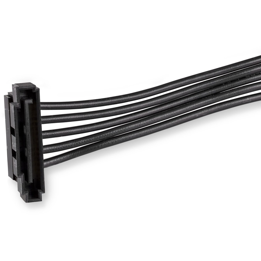 The PYO4SATA SATA power splitter cable (1-to-4) features a SATA male power connector that connects to a single computer power supply SATA connector, and breaks out into four SATA female power connectors.