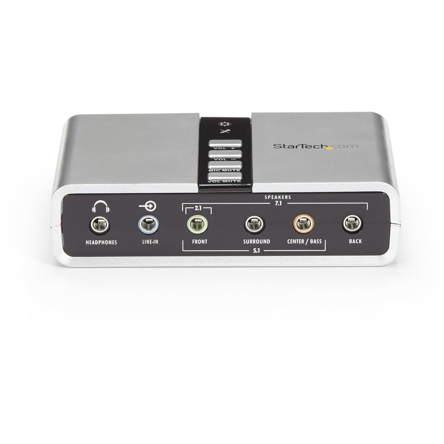 Providing a robust USB audio experience, the USB sound card connects to a host computer through a single USB 2.0 connection, to deliver impressive external audio capability that can instantly be swapped between systems, without having to open the computer case for installation.