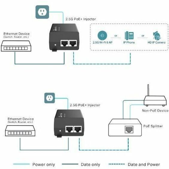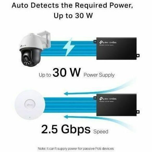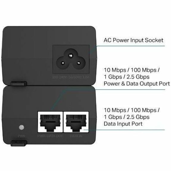 The 2.5G PoE+ Injector POE260S (TL-POE260S) fully complies with IEEE 802.3af/at standards, and can work with all IEEE 802.3af/at PoE compliant PDs (Powered Devices) or other equivalent products, to expand your network to where there are no power line or outlet, where you wish to fix device such as 2.5G AP, HD IP Camera or IP Phone, etc.