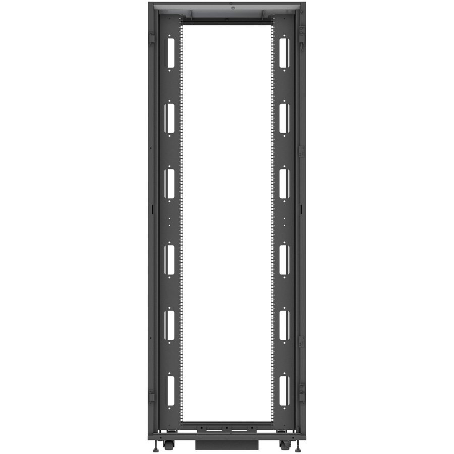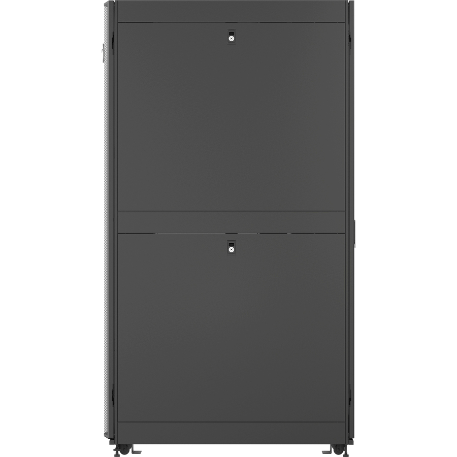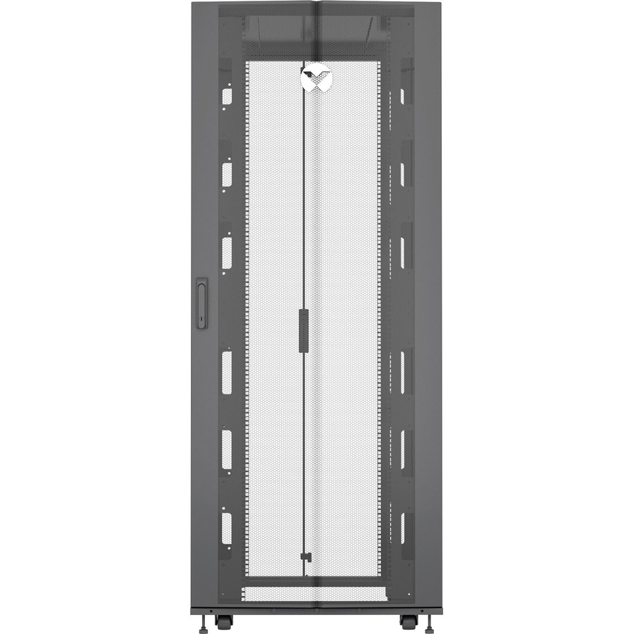The Vertiv VR Rack VR3357 is a 48U server rack built with reliable engineering and is designed for simple and easy configuration. It has dimensions of 2265mm x 800mm x 1200mm (height, width, and depth), and has a deep frame that provides users around 2.5 inches more useable depth than similar sized racks. It has load capacities of 3,000 pounds static and 2,500 pounds dynamic. It is delivered ready for high density environments and supports a wide variety of equipment, including: servers, storage, PDUs, UPSs, console servers, and KVM switches. The zero U spaces in the Vertiv VR Rack have brackets and mounting holes for tool-less installation and removal of rack PDUs and cable management accessories. Each rack also comes with two sets of 19-inch EIA rails for sliding shelves, and the rack has split side panels with single locking slam latch that allows for easy single person installation and removal.
