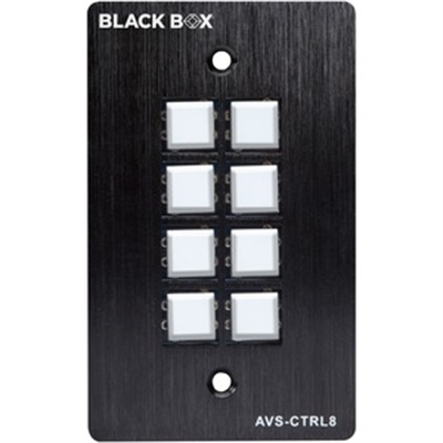 Wallplate-based control panel for AV devices. Each of the 8 buttons can be user programmed using the included software to send IR relay control or bi-directional RS-232 and RS-485 commands simultaneously to control third-party devices.The panel is designed in a high quality black metal finish with LED back lit buttons and fits into a standard single gang outlet box.